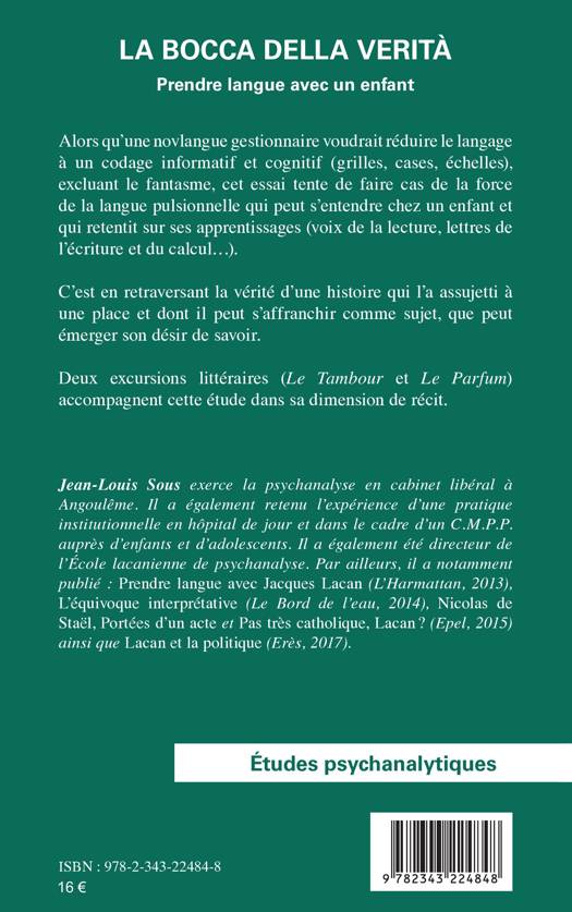 Alors qu’une novlangue gestionnaire voudrait réduire le langage à un codage informatif et cognitif (grilles, cases, échelles), excluant le fantasme, cet essai tente de faire cas de la force de la langue pulsionnelle qui peut s’entendre chez un enfant et qui retentit sur ses apprentissages (voix de la lecture, lettres de l’écriture et du calcul). C’est en retraversant la vérité d’une histoire qui l’a assujetti à une place et dont il peut s’affranchir comme sujet, que peut émerger son désir de savoir. Deux excursions littéraires (Le Tambour et Le Parfum) accompagnent cette étude dans sa dimension de récit.