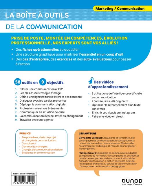 Découvrez 58 outils indispensables à la pratique de la communication d'entreprise au quotidien. Cette 5eédition tient compte de l’impact de l’intelligence artificielle dans le monde de la communication. Les outils dédiés aux réseaux sociaux, à la marque employeur et à l’engagement des salariés ont bien été remaniés. Enfin, un nouvel outil est consacré à l’entreprise à mission.