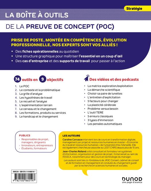 La boite à outils de la preuve de concept (POC) a vocation à procurer des outils pratiques pour maximiser les preuves de concept et accélérer les déploiements. 74 outils en 9 objectifs vous donneront toute la méthodologie de la preuve de concept et ses mécanismes d'apprentissage. En bonus, des outils pour prendre en compte la question du handicap sont disponibles.