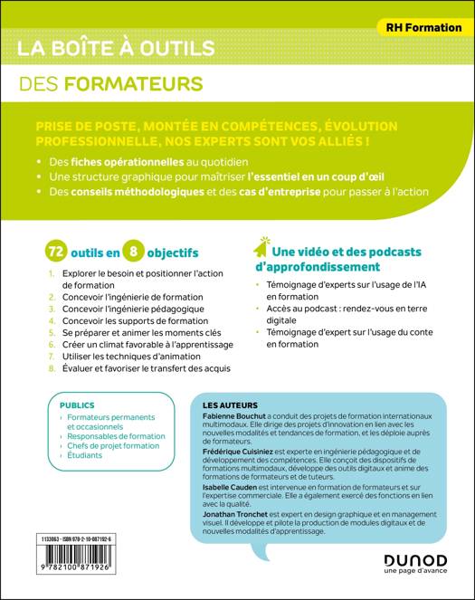 Elle est enrichie d’un podcast, de compléments en ligne et d’une vidéo qui donnent au lecteur un éclairage concret sur les différents outils de conception, d’animation et d’évaluation de la formation. Former ne s'improvise pas ! Maîtriser les méthodes et les techniques est absolument nécessaire pour concevoir, animer et réussir une action de formation et développer les compétences des participants.