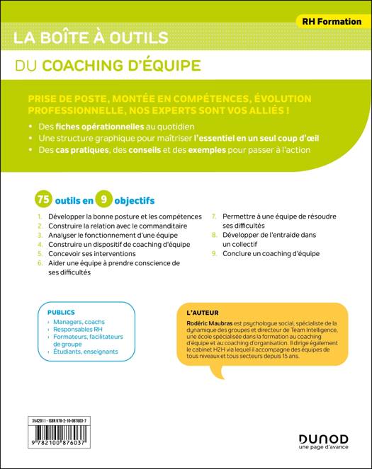 75 outils à décourir, de la rencontre avec le commanditaire jusqu’à la clôture du processus de coaching d'équipe, en passant par les grandes étapes de travail nécessaires à l’accompagnement de l’équipe concernée !