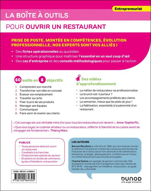 Alors que 25 % des restaurants (chiffre Gira) créés en France ne passent pas le cap de la cinquième année, les entrepreneurs du secteur ont un besoin accru d'accompagnement. Cette Boîte à outils fournit 60 outils essentiels pour piloter un restaurant avec succès, de sa création à son développement et sa pérennisation. L’ouvrage accompagne les restaurateurs, qu’ils soient en phase de lancement ou déjà établis, en leur donnant des clés concrètes pour affiner leur concept, bien choisir leur emplacement, fixer leurs prix, attirer et fidéliser leur clientèle, mais aussi optimiser leur gestion et leur rentabilité sur le long terme. Grâce au binôme co-auteurs expert/enseignante, cet ouvrage s’appuie sur une approche rigoureuse et pragmatique, issue de l’expérience du terrain.