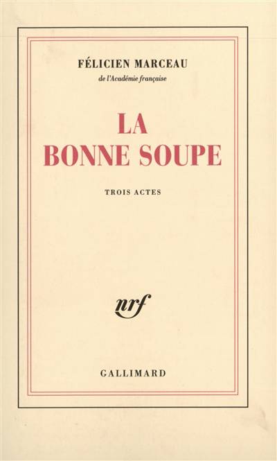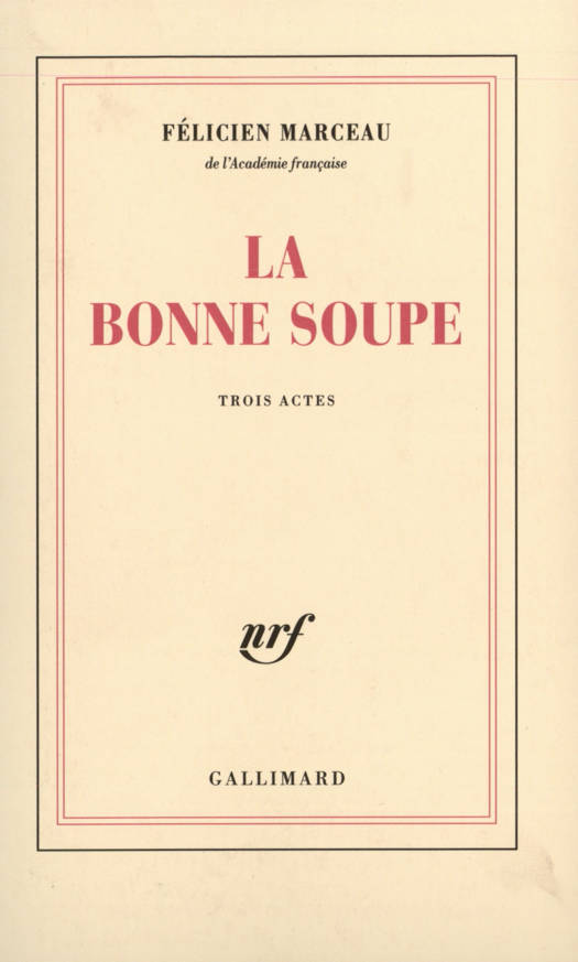 Lorsque l'on joua L'Œuf, la critique salua en Félicien Marceau, brillant romancier déjà, l'un des dramaturges les plus pénétrants et les plus originaux de notre temps. La Bonne Soupe est une pièce aussi peu conformiste que L'Œuf, aussi nouvelle, aussi libre dans sa composition et dans sa signification. C'est tout le destin d'une femme. Marie-Paule, luxueuse et séduisante quadragénaire, raconte sa vie au croupier d'un casino. Et cette vie qu'elle évoque se déroule sur la scène, à mesure. Voici Marie-Paule jeune fille, à Carcassonne ; elle séduit un jeune commerçant, file à Paris avec lui, se lance dans la galanterie, a un chagrin d'amour et trouve enfin une sécurité durement acquise dans un riche mariage. Mais cela n'est que l'intrigue. Le caractère de Marie-Paule, très dur, puissant, est habité par la peur. La peur de la misère, la peur de "manquer". C'est cette peur qui l'a conduite toute sa vie. C'est cette peur qui explique son âpreté, ses révoltes, son égoïsme. D'ailleurs la fatalité, ironique, la frappera le jour où, cessant de penser à elle exclusivement, elle se mêlera de vouloir faire le bonheur de sa fille. Une foule de personnages cocasses ou pittoresques escorte Marie-Paule pendant les vingt années qu'elle évoque, s'exprimant avec une justesse de ton très rare dans le théâtre contemporain. Félicien Marceau a inventé un langage dramatique vrai et simple comme la vie, ce qui ne l'empêche pas d'être, à la lettre, étincelant.