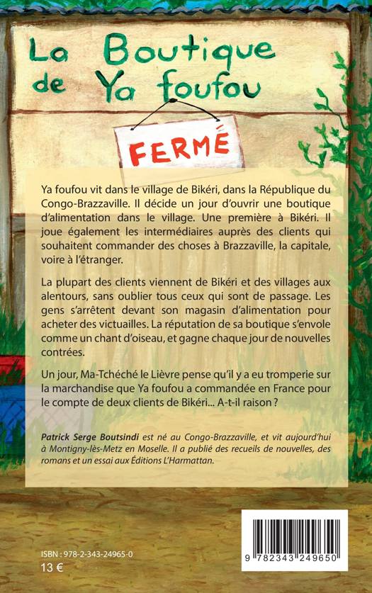 Ya foufou vit dans le village de Bikéri, dans la République du Congo-Brazzaville. Il décide un jour d’ouvrir une boutique d’alimentation dans le village. Une première à Bikéri. Il joue également les intermédiaires auprès des clients qui souhaitent commander des choses à Brazzaville, la capitale, voire à l’étranger. La plupart des clients viennent de Bikéri et des villages auxalentours, sans oublier tous ceux qui sont de passage. Les gens s’arrêtent devant son magasin d’alimentation pour acheter des victuailles. La réputation de sa boutique s’envole comme un chant d’oiseau, et gagne chaque jour de nouvelles contrées. Un jour, Ma-Tchéché le Lièvre pense qu’il y a eu tromperie sur la marchandise que Ya foufou a commandée en France pour le compte de deux clients de Bikéri... A-t-il raison ?