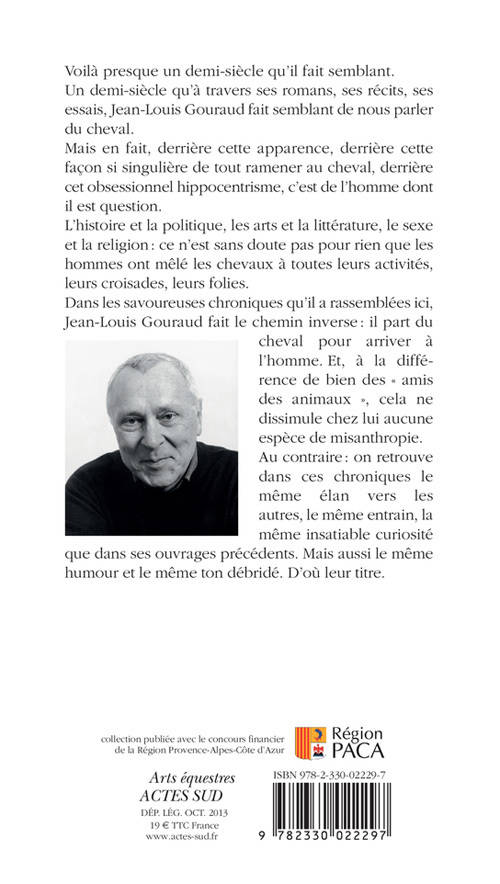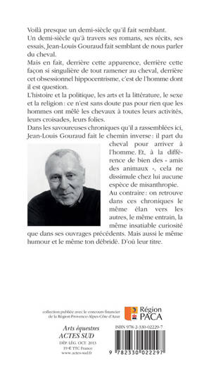 Dans les savoureuses chroniques qu'il a rassemblées ici, Jean-Louis Gouraud fait le chemin inverse : il part du cheval pour arriver à l'homme. Et, à la différence de bien des « amis des animaux », cela ne dissimule chez lui aucune espèce de misanthropie. Au contraire : on retrouve dans ces chroniques le même élan vers les autres , le même entrain, la même insatiable curiosité que dans ses ouvrages précédents. Mais aussi le même humour et le même ton débridé. D'où leur titre.