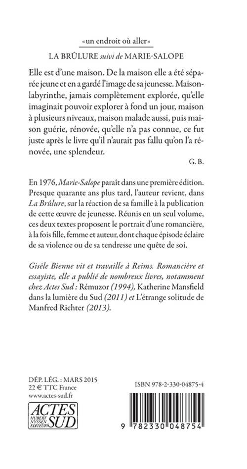 En 1976, «Marie-Salope» paraît dans une première édition. Presque quarante ans plus tard, l'auteur revient dans «La Brûlure» sur la réaction de sa famille à la publication de cette oeuvre de jeunesse. Réunis en un seul volume, ces deux textes proposent le portrait d'une romancière, à la fois fille, femme et auteur, dont chaque épisode éclaire de sa violence une quête de soi.