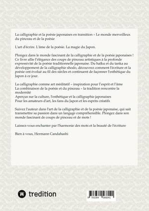 La calligraphie et la poésie japonaises en transition - Le monde merveilleux du pinceau et de la poésiePlongez dans le monde fascinant de la calligraphie et de la poésie japonaises ! Ce livre combine la beauté intemporelle de la calligraphie japonaise avec la poésie profonde des haïkus et tankas traditionnels. Apprenez comment la calligraphie et la poésie ont évolué au fil des siècles et découvrez le lien entre l'élégance esthétique, l'art méditatif et l'expressivité poétique. Une fois de plus, l'auteur Hermann Candahashi prouve qu'il est un connaisseur de la culture japonaise et qu'il a à juste titre un nom de renommée internationale.Parfait pour les amateurs de calligraphie, les fans du Japon et les passionnés de poésieDes aperçus inspirants sur l'art, la culture et l'histoire de l'écriture japonaiseZen et Écriture - Une combinaison harmonieuse de tradition et de modernitéIdéal pour la méditation, la pleine conscience et l'inspiration créativeQue vous soyez artiste, amateur d'écriture ou simplement fasciné par la culture japonaise, ce livre vous emmènera, de manière compréhensible, dans un monde plein de poésie, d'harmonie et de coups de pinceau artistiques. Laissez-vous inspirer et découvrez la beauté de la calligraphie japonaise de manière philosophique !Bien à vous, Hermann Candahashi