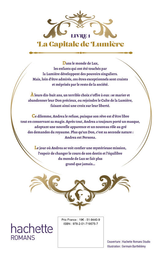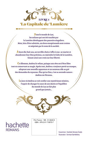 Dans le monde de Lux, les enfants qui ont été touchés par la Lumière développent des pouvoirs singuliers. Mais, loin d’être admirés, ces êtres exceptionnels sont craints et méprisés par le reste de la société. À leurs dix-huit ans, un terrible choix s’offre à eux : se marier et abandonner leur Don précieux, ou rejoindre le Culte de la Lumière, faisant ainsi une croix sur leur liberté. Ce dilemme, Andrea le refuse, puisque son rêve est d’être libre tout en conservant sa magie. Après tout, Andrea a toujours porté un masque, adoptant une nouvelle apparence et un nouveau rôle au gré des demandes du royaume. Plus qu’un Don, c’est sa seconde nature : Andrea est Persona. Le jour où Andrea se voit confier une mystérieuse mission, l’espoir de changer le cours de son destin et l’équilibre du monde de Lux se fait plus grand que jamais…