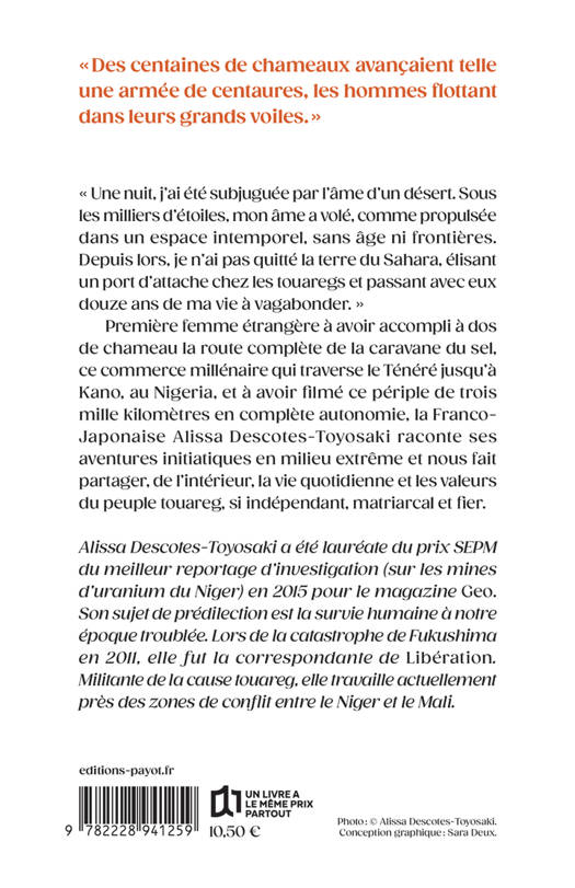 "Cinquante degrés, pas d'ombre, tout n'est que silence bercé par les pas feutrés des chameaux et le bruit des cordages qui grincent. " Alissa Descotes-Toyosaki est la première femme à "faire" la caravane du sel, commerce millénaire qui traverse le désert jusqu'au Niger. Quatre mois, trois mille kilomètres, du Sahara aux portes de l'Afrique noire. Un seul puits sur sept cents kilomètres. Elle raconte son périple, ses aventures, et le peuple touareg, si indépendant, fier et matriarcal. Son livre a reçu le prix Terres d'ailleurs 2025.