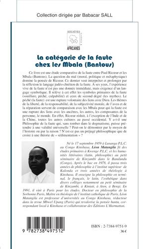 Ce livre est une étude comparative de la faute entre Paul Ricoeur et les Mbala (Bantous). La question du mal (moral, politique et métaphysique) domine la pensée de Ricoeur. Ce dernier veut interpréter et prolonger par la réflexion le langage judéo-chrétien de la faute. Les thèmes de la liberté, de la responsabilité, de la subjectivité morale, de l'aveu et de la réparation servent de comparaison chez les Mbala pour qui la faute est une rupture de lien avec les ancêtres, les autres.