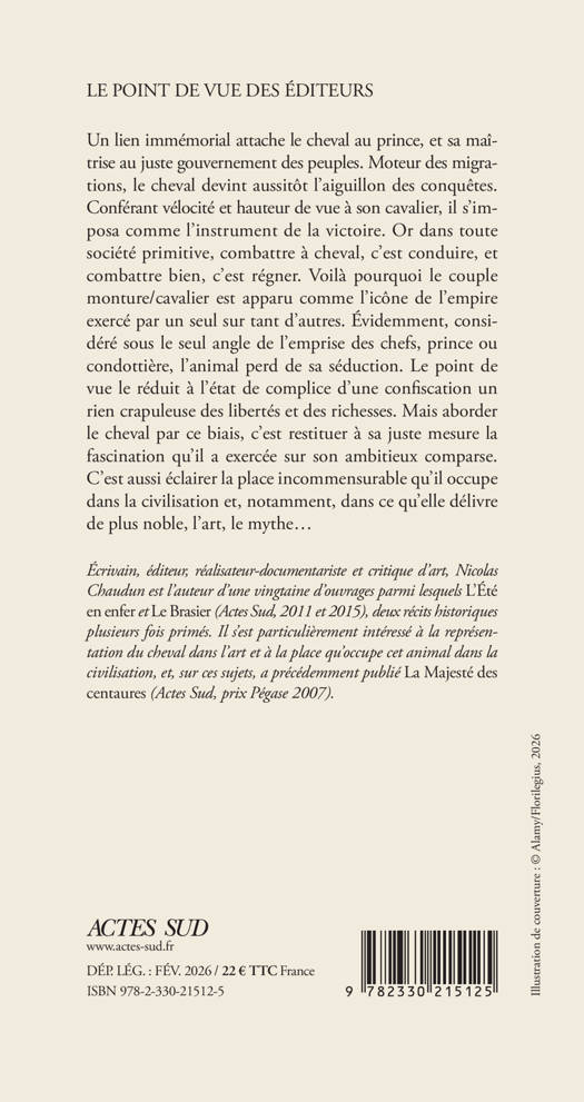 Un lien immémorial attache le cheval au prince, et sa maîtrise au juste gouvernement des peuples. Moteur des migrations, le cheval devint aussitôt l'aiguillon des conquêtes. Conférant vélocité et hauteur de vue à son cavalier, il s'imposa comme l'instrument de la victoire. Or dans toute société primitive, combattre à cheval, c'est conduire, et combattre bien, c'est régner. Voilà pourquoi le couple monture/cavalier est apparu comme l'icône de l'empire exercé par un seul sur tant d'autres. Évidemment, considéré sous le seul angle de l'emprise des chefs, prince ou condottière, l'animal perd de sa séduction. Le point de vue le réduit à l'état de complice d'une confiscation un rien crapuleuse des libertés et des richesses. Mais aborder le cheval par ce biais, c'est restituer à sa juste mesure la fascination qu'il a exercée sur son ambitieux comparse. C'est aussi éclairer la place incommensurable qu'il occupe dans la civilisation et, notamment, dans ce qu'elle délivre de plus noble, l'art, le mythe...