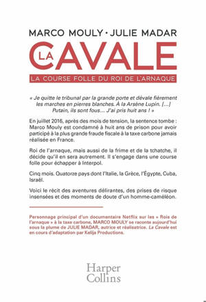 À propos de l'auteur : Personnage principal d’un documentaire Netflix sur les « Rois de l’arnaque » à la taxe carbone, Marco Mouly se raconte aujourd’hui sous la plume de Julie Madar, autrice et réalisatrice. La Cavale est en cours d’adaptation par Kelija Productions.