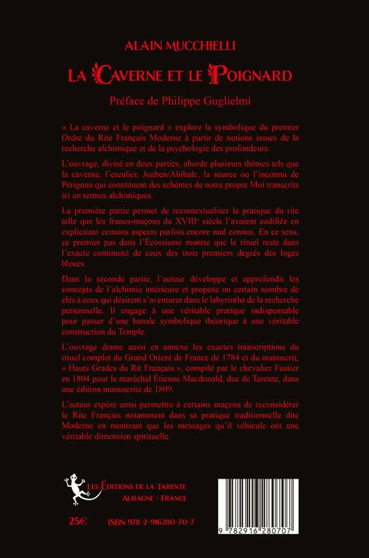 « La caverne et le poignard » explore la symbolique du premier Ordre du Rite Français Moderne à partir de notions issues de la recherche alchimique et de la psychologie des profondeurs. L’ouvrage, divisé en deux parties, aborde plusieurs thèmes tels que la caverne, l’escalier, Joaben/Abibalc, la source ou l’inconnu de Pérignan qui constituent des schèmes de notre propre Moi transcrits ici en termes alchimiques. La première partie permet de recontextualiser la pratique du rite telle que les francs-maçons du XVIIIe siècle l’avaient codifiée en explicitant certains aspects parfois encore mal connus. En ce sens, ce premier pas dans l’Écossisme montre que le rituel reste dans l’exacte continuité de ceux des trois premiers degrés des loges bleues. Dans la seconde partie, l’auteur développe et approfondit les concepts de l’alchimie intérieure et propose un certain nombre de clés à ceux qui désirent s’aventurer dans le labyrinthe de la recherche personnelle. Il engage à une véritable pratique indispensable pour passer d’une banale symbolique théorique à une véritable construction du Temple. L’ouvrage donne aussi en annexe les exactes transcriptions du rituel complet du Grand Orient de France de 1784 et du manuscrit, « Hauts Grades du Rit Français », compilé par le chevalier Fustier en 1804 pour le maréchal Étienne Macdonald, duc de Tarente, dans une édition manuscrite de 1809. L’auteur espère ainsi permettre à certains maçons de reconsidérer le Rite Français notamment dans sa pratique traditionnelle dite Moderne en montrant que les messages qu’il véhicule ont une véritable dimension spirituelle.