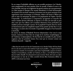 "La Chair" raconte un monde où tout est paramétré pour l'efficace. Sans marge. Au rythme des cours de la bourse. <br /><br /> Un monde où il n’y a pas de nom propre. <br /><br /> De la servitude volontaire a surgi une mécanique de l’aliénation absolue, aveugle, bétail.<br /><br /> Un monde d’hommes. Déversoir, la « femme » n’est plus qu’un buste, sexe et seins entretenus avec la plus rigoureuse hygiène en laboratoire et préparés selon le goût de son titulaire. De quoi procurer ce plaisir violent de l’oubli. Un buste de chair « chaude et odorante ». Une réminiscence d’un très lointain passé...<br /><br /> « S’oublier, seulement s’oublier », triompher de « l’angoisse permanente » de sa propre existence, mais avec tout de même l’obligation de perpétuer l’espèce. <br /><br /> Surgit le grain de sable dans ces rouages si bien huilés. Il n’y a plus de naissance. Le système s’écroule, l’espèce est condamnée.<br /><br /> Déshumanisé de n'être plus que fonctionnel le monde est confronté à la plus parfaite impuissance. Le vide. <br /> Qui-quoi donc trace à la peur la page de nos existences ? <br /><br /> C’est alors que quelque chose comme une âme commence à murmurer... <br /><br /> Car "La Chair" est, de toute évidence, une histoire d’amour.<br /><br /> À cette dystopie répond l’oeuvre picturale d’Élizabeth Prouvost, qui démantibule le corps humain, insinue le chaos dans les rouages de la machine morphologique et, de l’intérieur, la dysmorphise. Pour enfin, peut-être, mais alors seulement, du fin fond de ses entrailles, la sublimer.<br />