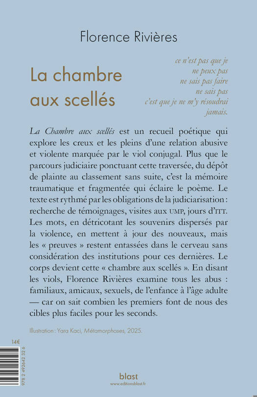 "La Chambre aux scellés" est un recueil poétique qui explore les creux et les pleins d'une relation abusive et violente marquée par le viol conjugal. Plus que le parcours judiciaire ponctuant cette traversée, du dépôt de plainte au classement sans suite, c'est la mémoire traumatique et fragmentée qui éclaire le poème. Le texte est rythmé par les obligations de la judiciarisation : recherche de témoignages, visites aux UMP, jours d'ITT. Les mots, en détricotant les souvenirs dispersés par la violence, en mettent à jour des nouveaux, mais les «Â preuves » restent entassées dans le cerveau sans considération des institutions pour ces dernières. Le corps devient cette «Â chambre aux scellés ». En disant les viols, Florence Rivières examine tous les abus : familiaux, amicaux, sexuels, de l'enfance à l'âge adule - car on sait combien les premiers font de nous des cibles plus faciles pour les seconds.