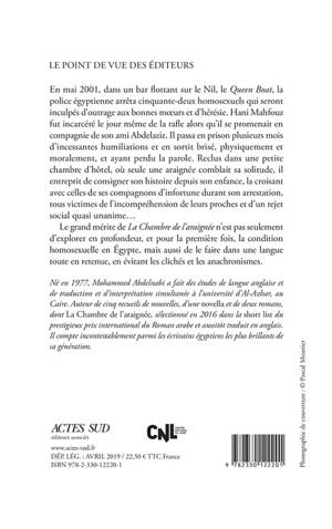 En mai 2001, dans un bar flottant sur le Nil, le «Queen Boat», la police égyptienne arrêta cinquante-deux homosexuels qui seront inculpés d'outrage aux bonnes moeurs et d'hérésie. Hani Mahfouz fut incarcéré le jour même de la rafle alors qu'il se promenait en compagnie de son ami Abdelaziz. Il passa en prison plusieurs mois d'incessantes humiliations et en sortit brisé, physiquement et moralement, et ayant perdu la parole. Reclus dans une petite chambre d'hôtel, où seule une araignée comblait sa solitude, il entreprit de consigner son histoire depuis son enfance, la croisant avec celles de ses compagnons d'infortune durant son arrestation, tous victimes de l'incompréhension de leurs proches et d'un rejet social quasi unanime...