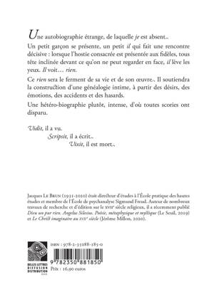Une autobiographie etrange, de laquelle je est absent. Un petit garcon se presente, un petit il qui fait une rencontre decisive: lorsque l'hostie consacree est presentee aux fideles, tous tete inclinee devant ce qu'on ne peut regarder en face, il leve les yeux. Il voit... rien. Ce rien sera le ferment de sa vie et de son oeuvre. Il soutiendra la construction d'une genealogie intime, a partir des desirs, des emotions, des accidents et des hasards. Une hetero-biographie plutot, intense, d'ou toutes scories ont disparu. Vidit, il a vu. Scripsit, il a ecrit. Vixit, il est mort.