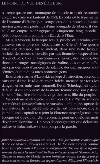 «Julia Leonidovna Latynina est née en 1966. Journaliste économique (Echo de Moscou, Novaya Gazeta et The Moscow Times), connue pour son opposition à Poutine et son franc-parler, elle signe régulièrement des articles montrant les liens entre le crime et l'économie. La Chasse au renne de Sibérie est son troisième roman. Les deux précédents sont parus en Russie sous le pseudonyme d'Evgueni Klimovitch»
