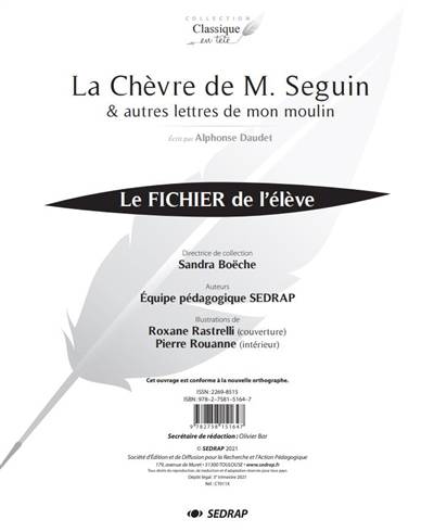 Chaque roman de la collection Classique en tête est accompagné d’un dossier de 44 pages à photocopier, conçu pour répondre à deux objectifs complémentaires : la ompréhension de texte avec 1 fiche sur la découverte du livre, 7 à 8 fiches par chapitre, 1 à 2 fiches sur le roman dans son ensemble, ainsi qu’une proposition de « débat » en classe, et la production écrite avec des activités de réécriture, de transformation, de prolongements…