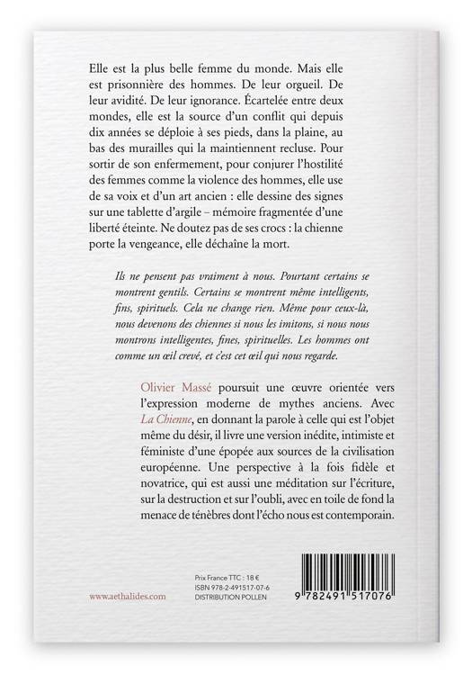 Elle est la plus belle femme du monde. Mais elle est prisonnière des hommes. De leur orgueil. De leur avidité. De leur ignorance. Elle est la source d'un conflit qui depuis dix ans se déploie à ses pieds, dans la plaine, au bas des murailles qui la maintiennent recluse. Pour sortir de son enfermement, pour conjurer l'hostilité des femmes comme la violence des hommes, elle use de sa voix et d'un art ancien : elle dessine des signes sur une tablette d'argile – mémoire fragmentée d'une liberté éteinte. Ne doutez pas de ses crocs : la chienne porte la vengeance, elle déchaîne la mort. Olivier Massé poursuit une Åuvre orientée vers l'expression moderne de mythes anciens. Avec La Chienne, en donnant la parole à celle qui est l'objet même du désir, il livre une version inédite, intimiste et féministe d'une épopée aux sources de la civilisation européenne. Une méditation sur l'écriture, sur la destruction et sur l'oubli, en toile de fond la menace de ténèbres dont l'écho nous est contemporain.