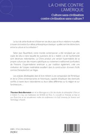 Dans cette étude, l'auteur observe la Chine et l'Amérique, leurs relations mutuelles et leur histoire. Entre civilisation américaine utopique qui s'illustre dans la construction d'univers fictifs tels que Las Vegas et Disneyland et l'image hyperréaliste que la Chine donne de sa propre culture, il développe une comparaison grâce à laquelle il explique les conflits et les différences qui opposent ces deux pays et se demande : quelles sont les distinctions entre culture et civilisation ?