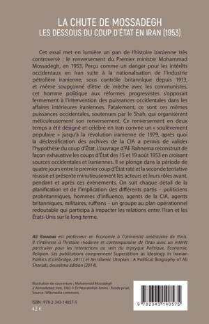 Cet essai met en lumière le renversement du Premier ministre Mohammad Mossadegh en 1953, perçu comme un danger pour les intérêts occidentaux en Iran suite à sa décision de nationaliser l'industrie pétrolière. D'abord désigné comme un "soulèvement populaire", ce renversement s'est avéré être un coup d'Etat orchestré notamment par les services secrets britanniques et américains. Croisant les sources occidentales et iraniennes, l'ouvrage nous plonge dans la période de quatre jours entre le premier coup d'Etat raté et la seconde tentative réussie, et présente les acteurs et leurs rôles avant, pendant et après ces événements.