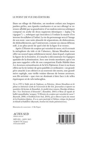 Après «L'Histoire du scorpion qui ruisselait de sueur», où il creusait la métaphore du vide et de l'absence, Akram Musallam nous offre un nouvel opus subtilement mené, dans lequel, explorant la figure de la frontière, il s'attache à déconstruire les logiques spatiales de la domination. Avec une ironie mordante, qui n'est pas sans rappeler celle de son compatriote Émile Habibi dans« Les Aventures extraordinaires de Sa'îd le Peptimiste», il met à nu leurs effets sur la vie intime de gens paisibles et ordinaires - un grandpère attaché à ses oliviers et au souvenir des morts, une grandmère espiègle, une vieille voisine diseuse de bonne aventure, son fils arriviste - que rien ne destinait à faire face à de telles équivoques ni de tels imbroglios.