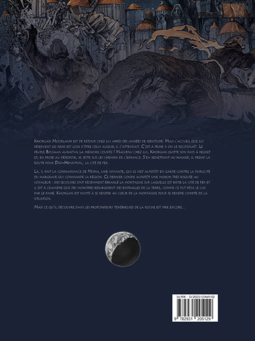 Khorgan Moorlanh est de retour chez lui après des années de servitude. Mais l'accueil que lui réservent les siens est loin d'être celui auquel il s'attendait. C'est à peine si on le reconnaît. Le peuple Bolsaan aurait-il la mémoire courte ? Malvenu chez lui, Khorgan quitte son pays à regret et, en proie au désespoir, se jette sur les chemins de l'errance. S'en remettant au hasard, il prend la route pour Där-Hennthäl. Là, il fait la connaissance de Mona, une voyante, qui le met aussitôt en garde contre le margrave qui commande la région. Ce dernier confie aussitôt une mission très risquée au voyageur : des secousses ont récemment ébranlé la montagne sur laquelle est bâtie la cité de fer et il est à craindre que des monstres resurgissent des entrailles de la terre, comme ce fut déjà le cas par le passé. Khorgan est invité à se rendre au coeur de la montagne pour se rendre compte de la situation. Mais ce qu'il découvre dans les profondeurs ténébreuses de la roche est pire encore...