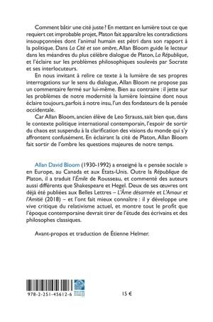 Comment bâtir une cité juste ? En mettant en lumière tout ce que requiert cet improbable projet, Platon fait apparaître les contradictions insoupçonnées dont l’animal humain est pétri dans son rapport à la politique. Dans La Cité et son ombre, Allan Bloom guide le lecteur dans les méandres du plus célèbre dialogue de Platon, La République, et l’éclaire sur les problèmes philosophiques soulevés par Socrate et ses interlocuteurs.