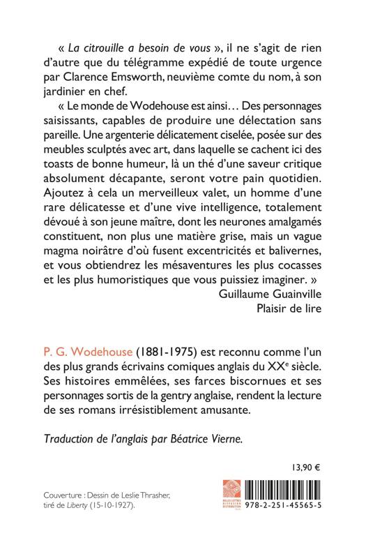 « La citrouille a besoin de vous », il ne s’agit de rien d’autre que du télégramme expédié de toute urgence par Clarence Emsworth, neuvième comte du nom, à son jardinier en chef. « Le monde de Wodehouse est ainsi… Des personnages saisissants, capables de produire une délectation sans pareille. Une argenterie délicatement ciselée, posée sur des meubles sculptés avec art, dans laquelle se cachent ici des toasts de bonne humeur, là un thé d’une saveur critique absolument décapante, seront votre pain quotidien. Ajoutez à cela un merveilleux valet, un homme d’une rare délicatesse et d’une vive intelligence, totalement dévoué à son jeune maître, dont les neurones amalgamés constituent, non plus une matière grise, mais un vague magma noirâtre d’où fusent excentricités et balivernes, et vous obtiendrez les mésaventures les plus cocasses et les plus humoristiques que vous puissiez imaginer. » Guillaume Guainville, Plaisir de lire