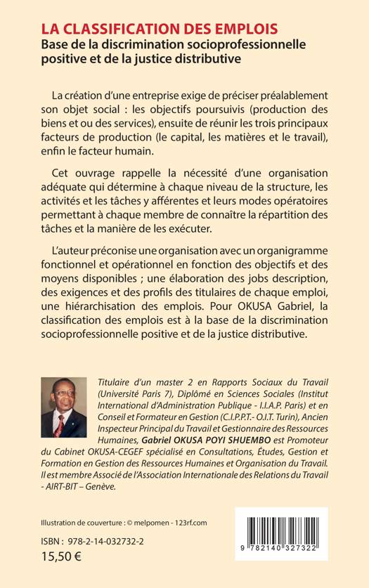 4è Couv La création d une entreprise exige de préciser préalablement son objet social: les objectifs poursuivis (production des biens et/ou des services), ensuite de réunir les trois principaux facteurs de production (le capital, les matières et le travail), enfin le facteur humain. Cet ouvrage rappelle la nécessité d une organisation adéquate qui détermine à chaque niveau de la structure, les activités et les tâches y afférentes et leurs modes opératoires permettant à chaque membre de connaître la répartition des tâches et la manière de les exécuter. L auteur préconise une organisation avec un organigramme fonctionnel et opérationnel en fonction des objectifs et des moyens disponibles; une élaboration des jobs description, des exigences et des profils des titulaires de chaque emploi, une hiérarchisation des emplois. Pour OKUSA Gabriel, la classification des emplois est à la base de la discrimination socioprofessionnelle positive et de la justice distributive.