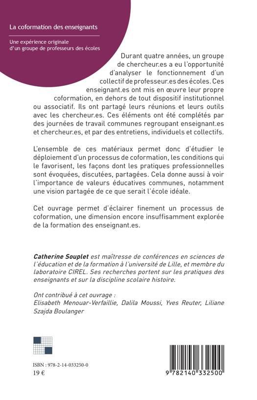 Durant quatre années, un groupe de chercheur.es a eu l'opportunité d'analyser le fonctionnement d'un collectif de professeur.es des écoles. Ces enseignant.es ont mis en oeuvre leur propre coformation, en dehors de tout dispositif institutionnel ou associatif. Ils ont partagé leurs réunions et leurs outils avec les chercheur.es. Ces éléments ont été complétés par des journées de travail communes regroupant enseignant.es et chercheur.es, et par des entretiens, individuels et collectifs. L'ensemble de ces matériaux permet donc d'étudier le déploiement d'un processus de coformation, les conditions qui le favorisent, les façons dont les pratiques professionnelles sont évoquées, discutées, partagées. Cela donne aussi à voir l'importance de valeurs éducatives communes, notamment une vision partagée de ce que serait l école idéale. Cet ouvrage permet d'éclairer finement un processus de coformation, une dimension encore insuffisamment explorée de la formation des enseignant.es.