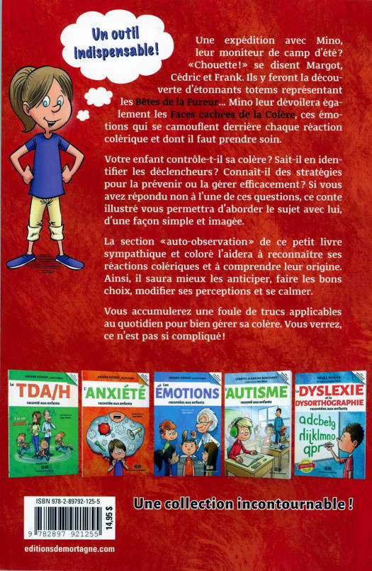 Une expédition avec Mino, leur moniteur de camp d’été? « Chouette ! » se disent Margot, Cédric et Frank. Ils y feront la découverte d’étonnants totems représentant les « Bêtes de la Fureur »… Mino leur dévoilera également les « Faces cachées de la Colère », ces émotions qui se camouflent derrière chaque réaction colérique et dont il faut prendre soin. Votre enfant contrôle-t-il sa colère ? Sait-il en identifier les déclencheurs ? Connaît-il des stratégies pour la prévenir ou la gérer efficacement ? Si vous avez répondu non à l’une de ces questions, ce conte illustré vous permettra d’aborder le sujet avec lui, d’une façon simple et imagée. La section « auto-observation » de ce petit livre sympathique et coloré l’aidera à reconnaître ses réactions colériques et à comprendre leur origine. Ainsi, il saura mieux les anticiper, faire les bons choix, modifier ses perceptions et se calmer. Vous accumulerez une foule de trucs applicables au quotidien pour bien gérer sa colère.