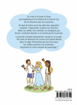 Ce n’est pas le froid, ni l’hiver qui va empêcher les enfants de la Colo du Lac de se retrouver pour les vacances. Et, quoi de mieux qu’un lac gelé pour apprendre à patiner ! Les infatigables jumeaux, Gabriel, Tori et Charlotte s’y adonnent à cœur joie. Même Myriam, d’habitude si sage, se laisse entraîner. La journée s’écoule joyeusement, lorsqu’un cri surgit : Tori vient de découvrir une biche allongée et blessée. En indéfectible protectrice des animaux, elle n’a plus qu’une idée en tête : secourir la biche ! Y parviendra-t-elle ? Heureusement ses amis sont là pour l’aider ! Un récit plein de vie, qui donnera aux jeunes enfants le goût de l’exploration, de l’autonomie et de l’entraide.