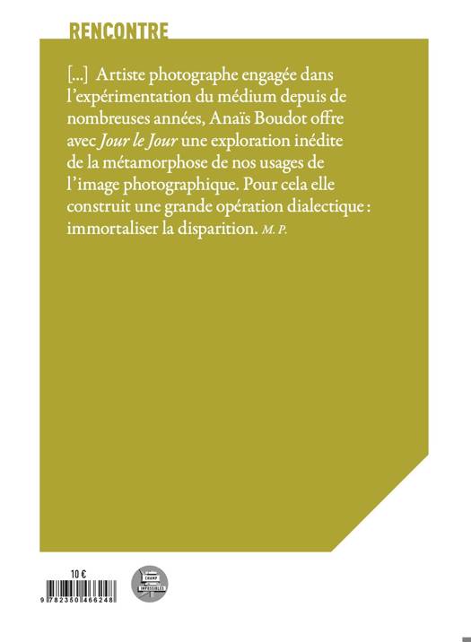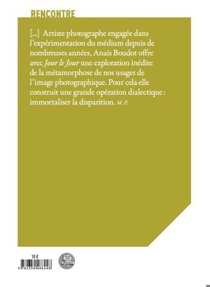 Anaïs Boudot poursuit actuellement une exploration approfondie des moyens photographiques, intégrant ponctuellement des séries réalisées à la gélatine photosensible sur verre, souvent rehaussées de peinture. Ses créations se situent sur un fil indéterminé entre contemporain et passé. Durant sa résidence, elle souhaite ouvrir de nouvelles perspectives pour ces images sur verre, cherchant à établir un lien entre patrimoine et art contemporain, en utilisant notamment la forme du vitrail. Cette approche vise à redéfinir et enrichir la perception des oeuvres en y intégrant des éléments historiques et artistiques. Michel Poivert, dans son texte, met en lumière l'engagement d'Anaïs Boudot dans l'expérimentation photographique. Avec son projet "Jour le Jour", elle explore la métamorphose des usages photographiques modernes en construisant une opération dialectique qui cherche à immortaliser la disparition. Poivert explique que, dans notre quotidien, nous enregistrons compulsivement des images avec nos smartphones, créant des archives personnelles de souvenirs, notes et coups de coeur. Toutefois, ces images sont souvent vouées à l'obsolescence : elles sont effacées, oubliées ou détruites lors d'un changement d'appareil. Cette situation paradoxale, où les images numériques incarnent la modernité tout en étant éphémères, est au coeur de la réflexion d'Anaïs Boudot, qui tente de capturer et de donner un sens durable à cette fugacité.
