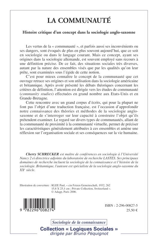 Le concept de communauté, qui a ses origines dans la sociologie allemande, est souvent employé sans recours à une définition précise. Des situations sociales très diverses sont examinées sous l'égide de cette notion. Cet ouvrage retrace les origines de ce concept et son utilisation dans la sociologie américaine et britannique. Après avoir présenté les débats théoriques, l'attention est dirigée vers les études de communauté (community studies) effectuées en grand nombre aux USA et en Grande-Bretagne.