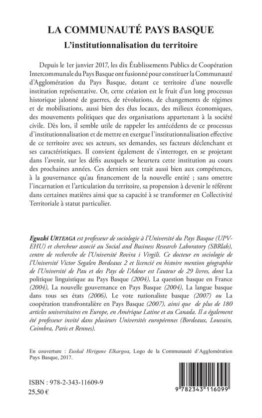 Depuis le 1er janvier 2017, les dix Établissements Publics de Coopération Intercommunale du Pays Basque ont fusionné pour constituer la Communauté d'Agglomération du Pays Basque, dotant ce territoire d'une nouvelle institution représentative. Or, cette création est le fruit d'un long processus historique jalonné de guerres et de révolutions. Cet ouvrage se propose de revenir sur les antécédents de ce processus d'institutionnalisation, en mettant en exergue l'institutionnalisation effective du territoire basque avec ses acteurs, ses demandes et ses caractéristiques.