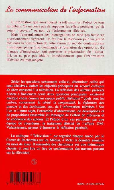 La réflexion des auteurs a ici cerné deux questions principales : existe-t-il quelque chose comme un espace public télévisuel ? Quels sont les cadres, concernant la vérité, la temporalité, la définition des acteurs et des institutions, etc., de l'information télévisée ? Sur l'un et l'autre sujet, l'ensemble d'observations, de descriptions et de propositions rassemblé ici témoigne de l'effort de précision et de cohérence des auteurs. Et l'étude d'un cas particulier par une équipe de chercheurs, le traitement télévisé de l'affaire OM-Valenciennes, permet d'éprouver la réflexion générale.