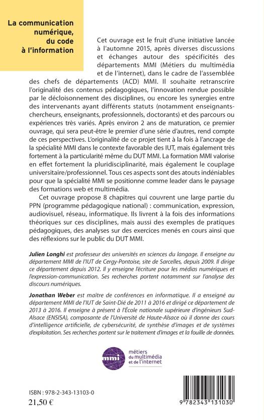 Cet ouvrage est le fruit d'une initiative autour des spécificités des départements MMI (Métiers du multimédia et de l'internet). Il souhaite retranscrire l'originalité des contenus pédagogiques, l'innovation rendue possible par le décloisonnement des disciplines ou encore les synergies entre les intervenants. Cet ouvrage couvre une large partie du Programme Pédagogique National (PPN) : communication, expertise audiovisuelle, réseau informatique, tant d'un point de vue théorique que pratique.