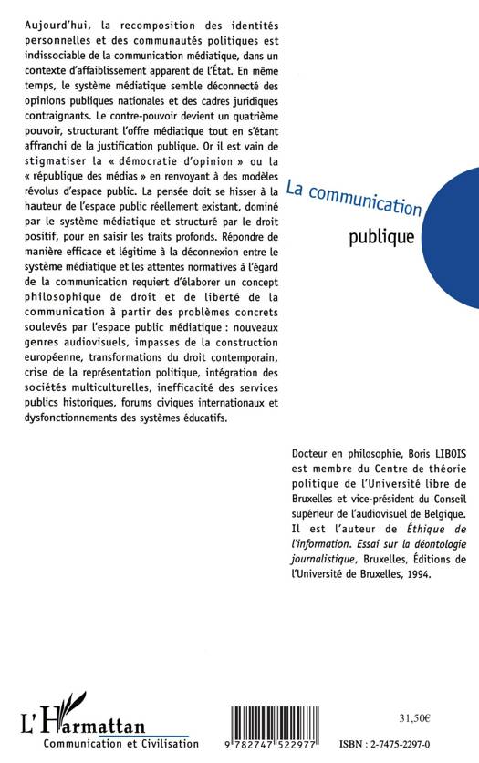 L'intérêt qui guide cette réflexion est celui de la régulation efficace et légitime du système médiatique. Il s'agit de déterminer le fondement du droit à la communication. Pour ce faire la communication médiatique devrait pouvoir être considérée comme un objet philosophique à part entière. S'appuyant sue les théories du philosophe et logicien Ch. Pierce, il s'agit de penser la communication à un niveau catégoriel qui puisse rendre compte de manière réaliste du fait politique de l'espace public.