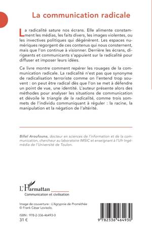 La radicalité sature nos écrans. Elle alimente constamment les médias, les faits divers, les images violentes, ou les invectives politiques qui dégénèrent. Les espaces numériques regorgent de ces contenus qui nous consternent, mais que l'on continue à visionner. Derrière les écrans, dirigeants et communicants s'appuient sur la radicalité pour diffuser et imposer leurs idées. Ce livre montre comment repérer les rouages de la communication radicale. La radicalité n'est pas que synonyme de radicalisation terroriste comme on l'entend trop souvent on peut être radical dès que l'on se met à défendre un point de vue, une identité. L'auteur présente alors des méthodes pour analyser les situations de communication et dévoile le triangle de la radicalité, comme trois sommets de l'individu communiquant à réguler la racine, la manipulation et la négation de l'altérité.