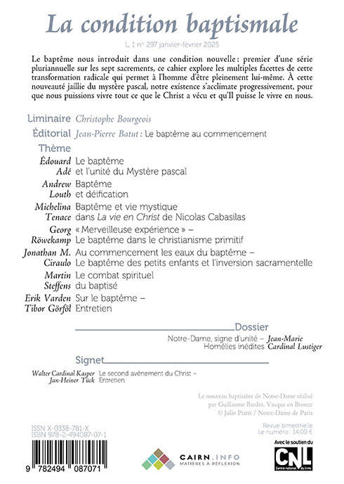 Communio renoue en 2025 avec le principe des séries thématiques et se propose d'explorer dans les années à venir le sens de la vie sacramentelle : les sept sacrements nous montrent comment notre existence peut être dilatée et renouvelée dans le mystère du Christ, afin d' atteindre sa vraie dimension. Le baptême ne se réduit pas à un rite d'entrée dans l'Église : c'est la vérité de notre condition humaine qui se dit dans la condition baptismale , l'homme y apparaît tel qu'en lui-même, choisi « avant la fondation du monde » pour être saint (Ep 1, 4).