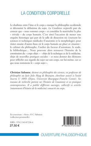 La Condition corporelle donne l’occasion de mener une enquête historique qui part de la salle de dissection pour visiter ensuite d’autres lieux où le corps humain est placé en situation : le cabinet du philosophe, l’atelier du facteur d’automate, le stade, la bibliothèque... Nous pouvons alors retrouver l’histoire de la constitution du « corps objet » – objet de la technique et de la médecine, objet de nouvelles pratiques sociales – et nous donner des éléments pour réfléchir aux regards du sujet sur son corps, sur lui-même, sur ce que nous nommons le « corps sujet ».