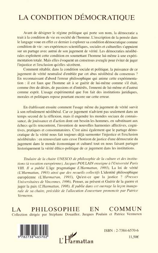 Avant de désigner le régime politique qui porte son nom, la démocratie à trait à la condition de vie de l'homme en société. Une réflexion sur la "condition démocratique" des êtres humains au sein de nos démocraties néolibérales qui s'unissent dans un consensus aveugle pour éviter de juger l'injustice et l'exclusion qu'elles sécrètent. Comment rétablir dans ces conditions un jugement de vérité ?
