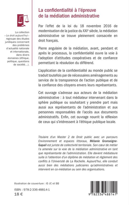 Par l'effet de la loi du 18 novembre 2016 de modernisation de la justice du XXIe siècle, la médiation administrative se trouve pleinement consacrée en droit français. Pierre angulaire de la médiation, avant, pendant et après le processus, la confidentialité ouvre la voie à l'adoption d'attitudes coopératives et de confiance permettant la résolution du différend. L'application de la confidentialité au monde public se traduit toutefois par de nécessaires aménagements au service de la transparence de l'action publique et de la confiance des citoyens envers leurs représentants. Cet ouvrage s'adresse aux acteurs de la médiation administrative: à tout médiateur intervenant dans la sphère publique ou souhaitant y prendre part mais aussi aux représentants de l'administration et aux personnes responsables de l'accès aux documents administratifs. Enfin, cet ouvrage nourrit la réflexion de ceux qui s'intéressent à l'éthique publique locale.
