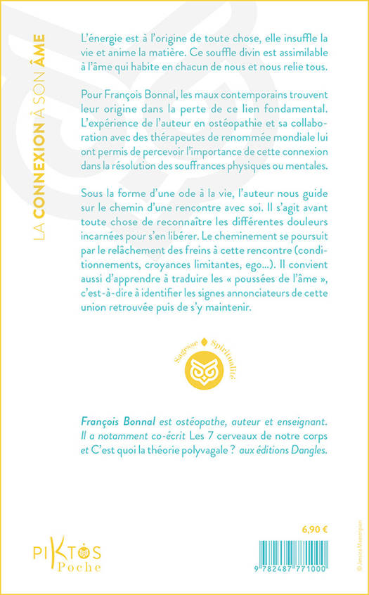 L’énergie est à l’origine de toute chose, elle insuffle la vie et anime la matière. Ce souffle divin est assimilable à l’âme qui habite en chacun de nous et nous relie tous. Pour François Bonnal, les maux contemporains trouvent leur origine dans la perte de ce lien fondamental. L’expérience de l’auteur en ostéopathie et sa collaboration avec des thérapeutes de renommée mondiale lui ont permis de percevoir l’importance de cette connexion dans la résolution des souffrances physiques ou mentales. Sous la forme d’une ode à la vie, l’auteur nous guide sur le chemin d’une rencontre avec soi. Il s’agit avant toute chose de reconnaître les différentes douleurs incarnées pour s’en libérer. Le cheminement se poursuit par le relâchement des freins à cette rencontre (conditionnements, croyances limitantes, ego…). Il convient aussi d’apprendre à traduire les « poussées de l’âme », c’est-à-dire à identifier les signes annonciateurs de cette union retrouvée puis de s’y maintenir.