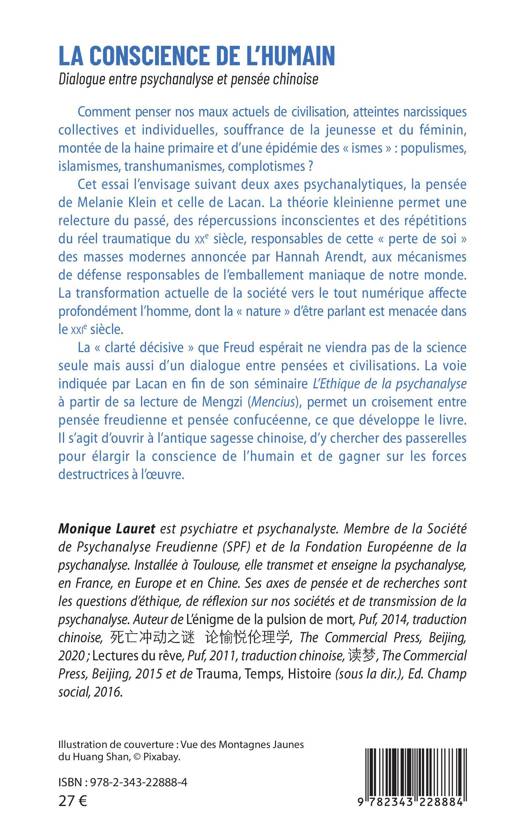 Comment penser nos maux actuels de civilisation, atteintes narcissiques, souffrance de la jeunesse et du féminin, montée de la haine primaire et d'une épidémie des « isme s» : populismes, islamismes? Cet essai l'envisage suivant deux axes psychanalytiques la pensée de Melanie Klein et celle de Lacan. La théorie kleinienne permet une relecture du passé. La voie indiquée par Lacan permet un croisement entre pensée freudienne et pensée confucéenne, ce que développe le livre. Il s'agit d'ouvrir à l'antique sagesse chinoise, d'y chercher des passerelles pour élargir la conscience de l'humain et de gagner sur les forces destructrices à l'oeuvre.