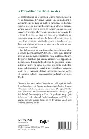 Les événements les plus inattendus interviennent dans la vie des personnages de Clemens J. Setz. Leur créateur nous les raconte avec compassion, voire tendresse. Il ouvre des portes dérobées qui nous laissent entrevoir des apparitions mystérieuses, d'insondables abîmes du quotidien ; d'une histoire à l'autre, on croise quelques revenants, et des formules délicieusement trouvées. «La Consolation des choses rondes» est un livre plein de feux follets et de doubles fonds, à la narration radicale, passionnant jusque dans les moindres détails.