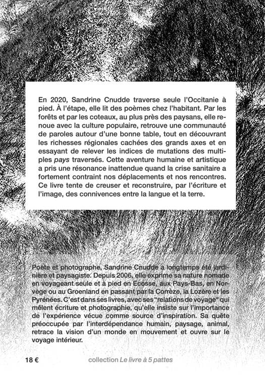En 2020, Sandrine Cnudde traverse seule la région Occitanie à pied, notant ses observations et photographiant paysages, gens et animaux. Elle en profite aussi pour faire des lectures publiques de ses textes chez des habitants. Au retour, elle travaille la mise en forme de ses collectes révélant des espaces invisibles, des liens silencieux qui unissent les hommes à leur territoire.<br /><br /><br /><br /><br /><br />