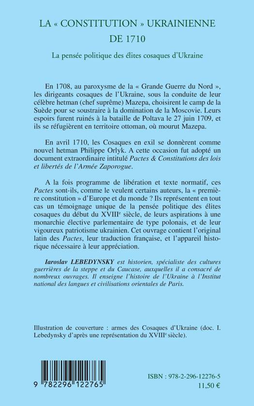 A la fois programme de libération et texte normatif, les Pactes & Constitutions des lois et libertés de l'Armée Zaporogue, adoptés en avril 1710 par les Cosaques en exil, sont-ils la "première constitution" d'Europe et du monde ? Ils représentent en tout cas un témoignage unique de la pensée politique des élites cosaques de l'époque, de leurs aspirations à une monarchie élective parlementaire de type polonais et de leur vigoureux patriotisme ukrainien. Cet ouvrage contient l'original latin des Pactes, leur traduction française et l'appareil historique nécessaire à leur appréciation.